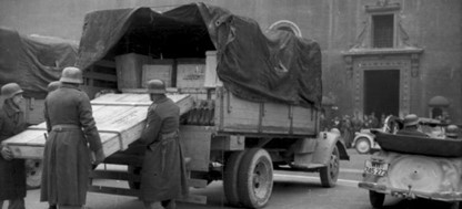 Foto: Die "Überführung" von Waren und Kulturgütern aus den okkupierten Staaten gehörte zum Alltagsgeschäft der deutschen "Neuordnung Europas" und nahm in Polen Formen bandenmäßiger Gewohnheitsverbrechen an. Schenker war daran führend beteiligt. Das Foto deutscher Propagandatruppen zeigt eine angebliche Sicherung von Kunstwerken in Rom. (Bundesarchiv_Bild101I-729-0003-13)