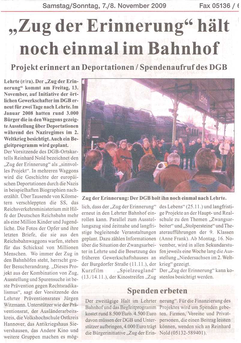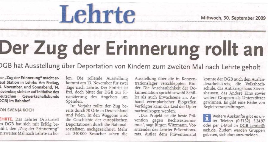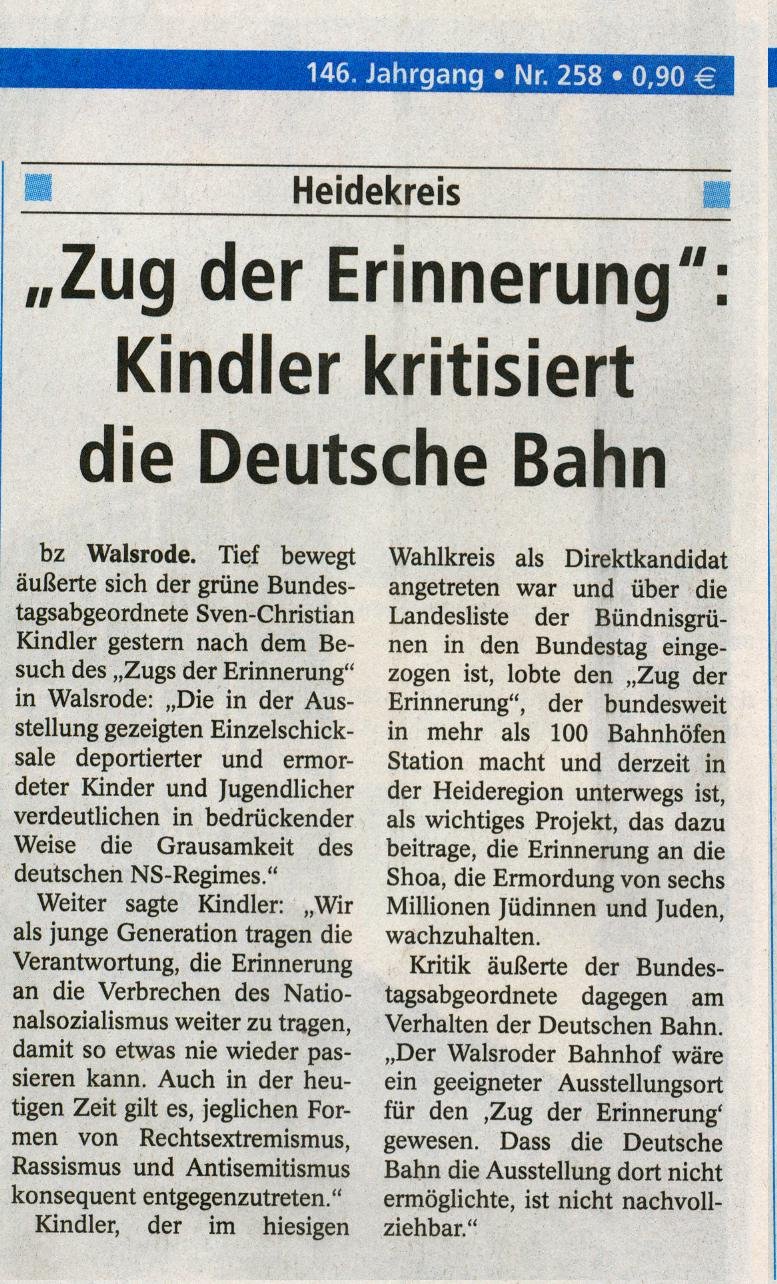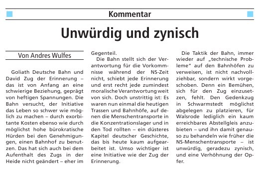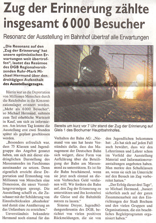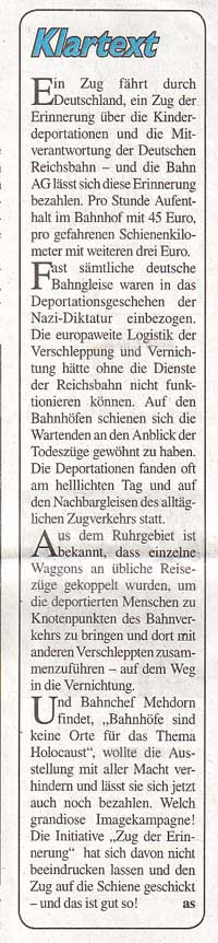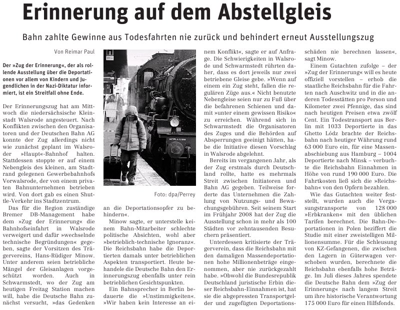 Kilometer für Kilometer Leid. (pdf) Ohne Unterstützung der Deutschen Bahn erinnert ein Ausstellungszug an die Deportation in der NS-Zeit. Von Stefan Reichert