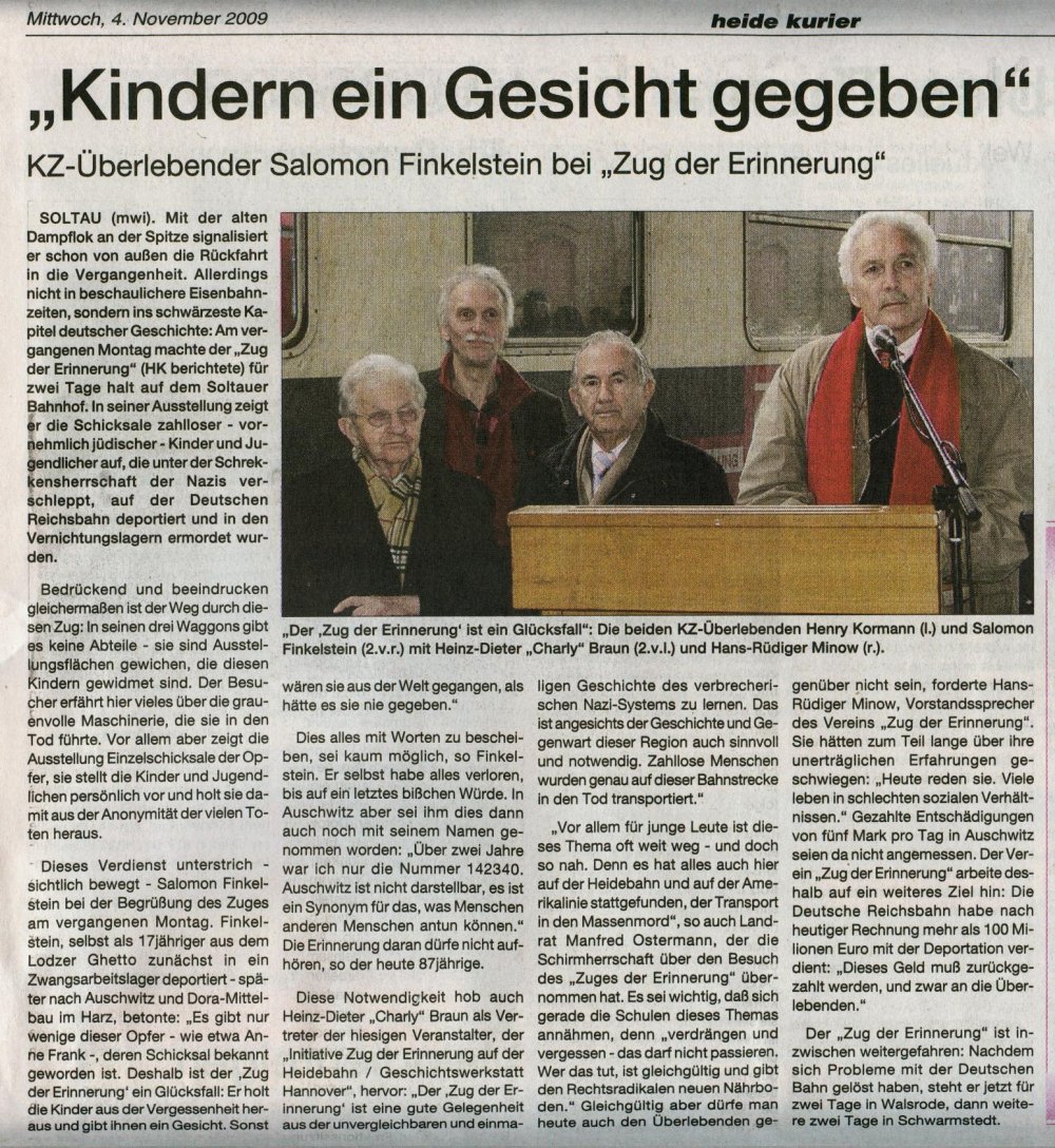 Anläßlich der Einweihung einer Gedenkplakette hielt der "Zug der Erinnerung" am 9. November 2015 auf dem Chemnitzer Hauptbahnhof die folgende Rede: Über 3 Millionen Menschen hat die Deutsche Reichsbahn in die Vernichtungslager deportiert, darunter mehr als 1 Million Jugendliche und Kinder. Diese 3 Millionen: das ist die Hälfte der Opfer der Shoa.