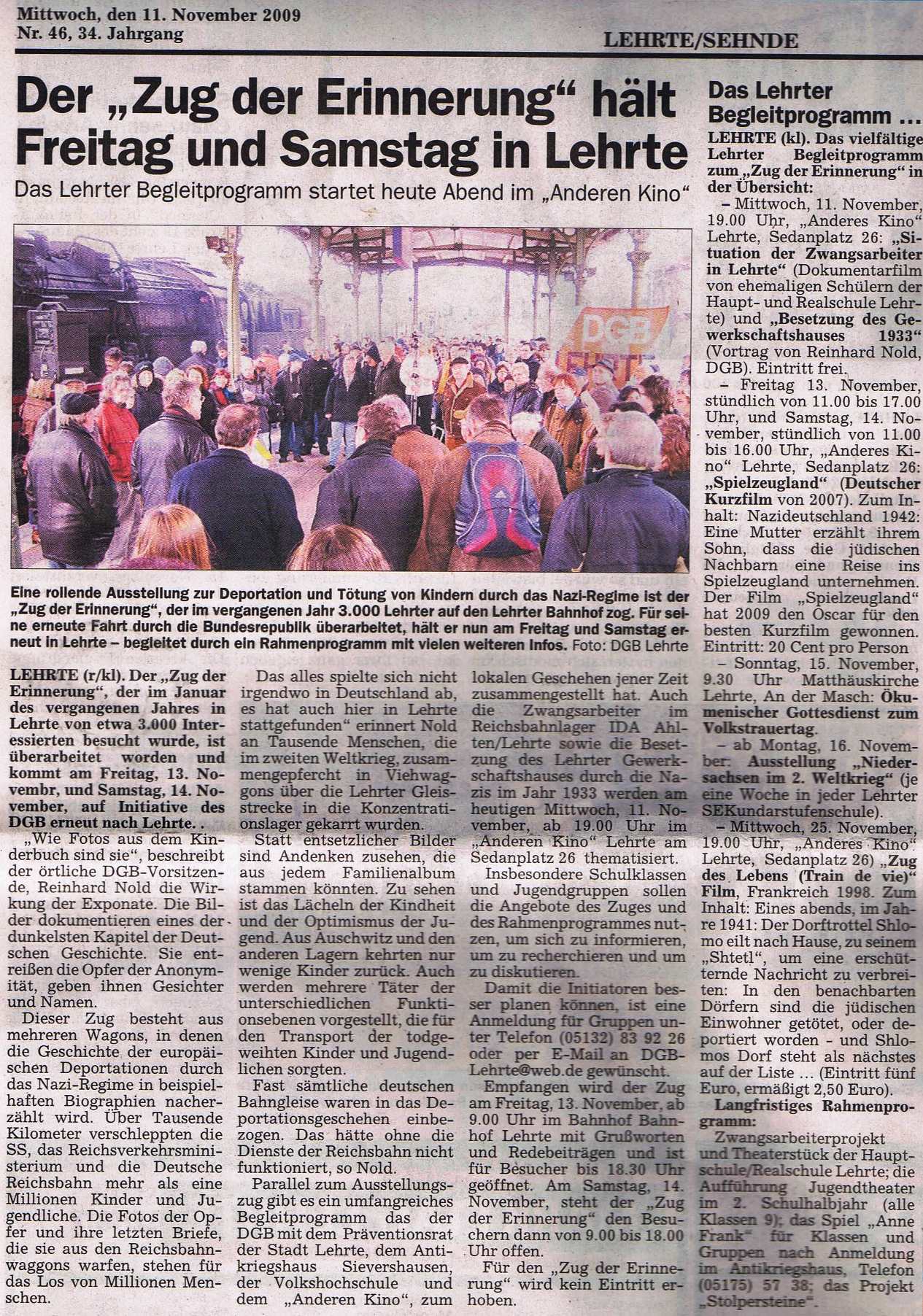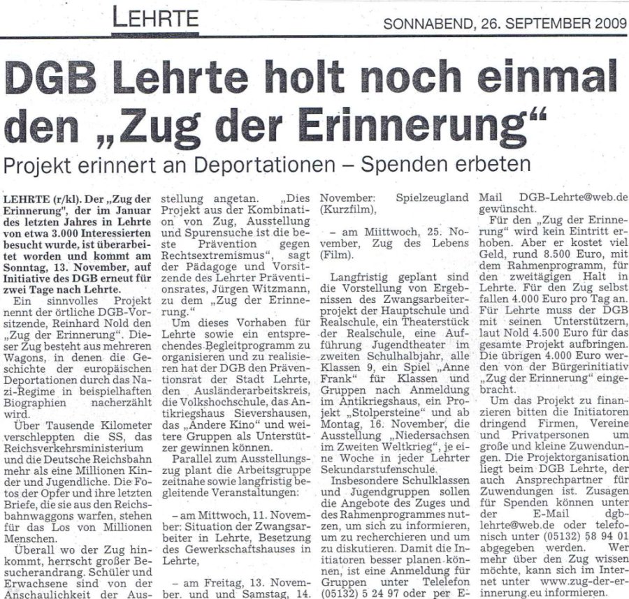Der Zug der Erinnerung will im Oktober mit Jugendlichen zum ehemaligen Konzentrations- und Vernichtungslager Sobibór fahren. Auf der Fahrt soll an die mehr als 200.000 ermordeten jüdischen Menschen erinnert werden, die in Sobobór oder auf dem Weg dorthin gestorben sind. Anlass ist der Jahrestag des Aufstands in Sobibór, bei dem sich 600 Häftlinge gegen die SS zur Wehr setzten.