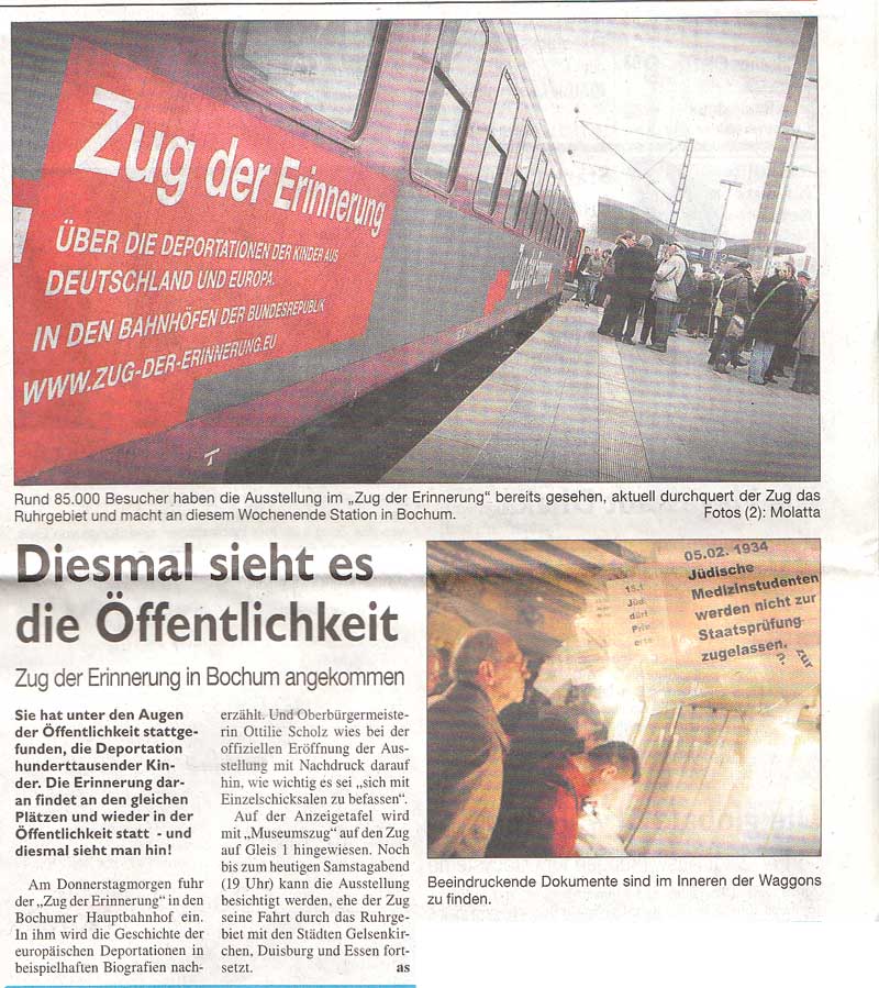 Mit einer überarbeiteten Ausstellung macht der zug der Erinnerung vom 10.12. Juni wieder in Dortmund auf dem Hauptbahnhof Station. Im Mittelpüunkt stehen die Deportationen aus dem niederländischen Westerbork in die Vernichtungslager. Zahlreiche Familien aus Nordrhein-Westfalen waren davon betroffen.
